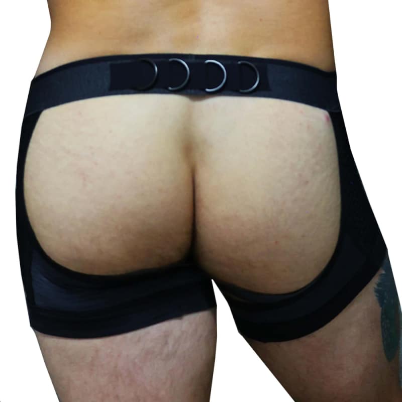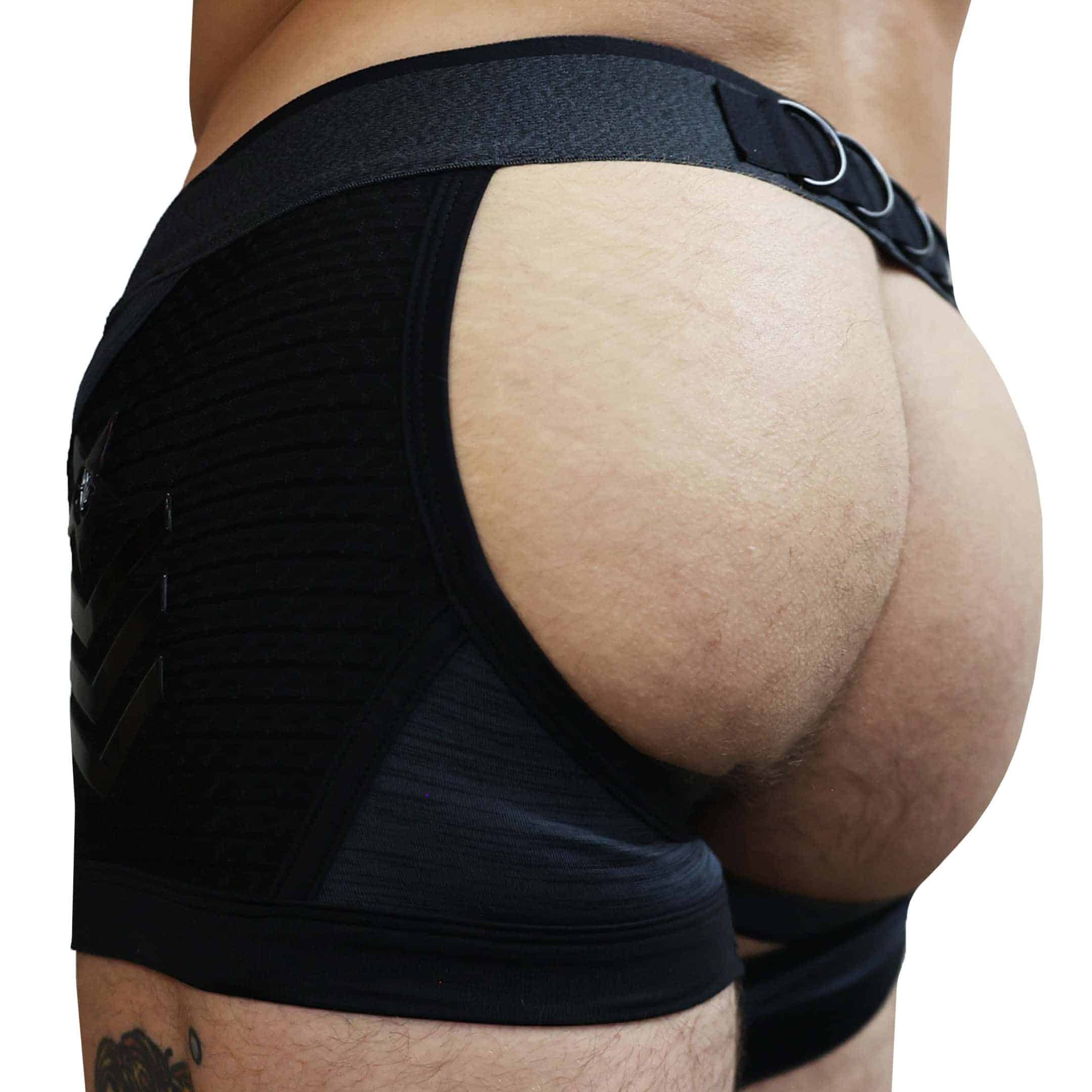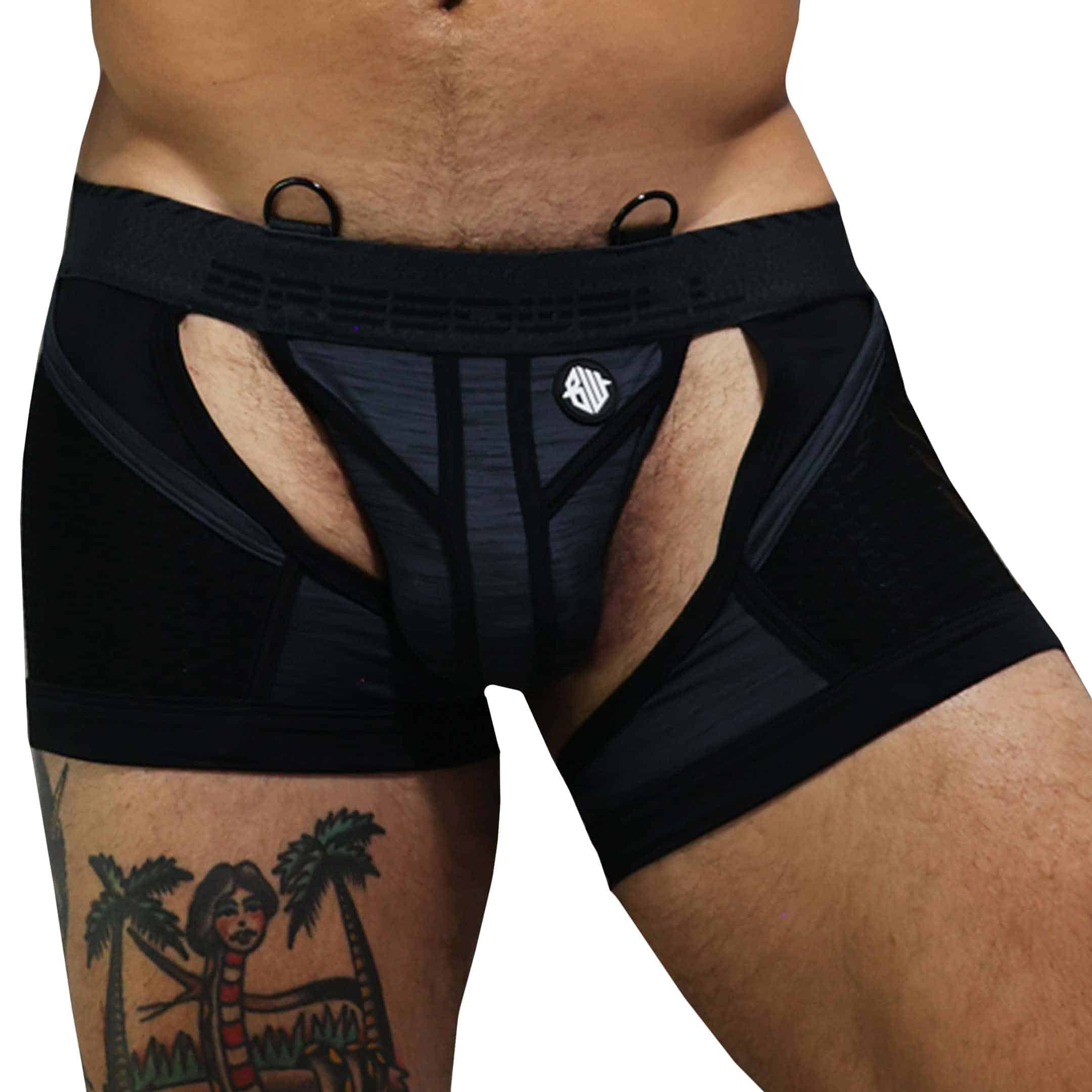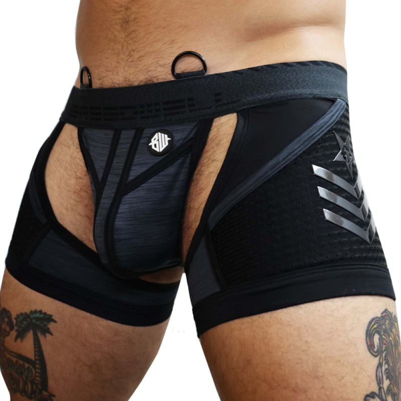 Underwear with an original and provocative design combining a jockstrap and a boxer. Made from soft and light mottled microfiber. Mesh side pockets. Silicone military-inspired pattern on left leg. Contrasting stripes highlight the front pouch. Elastic waistband with 2 metallic D-rings on the front and 4 at the back. Breedwell patch.