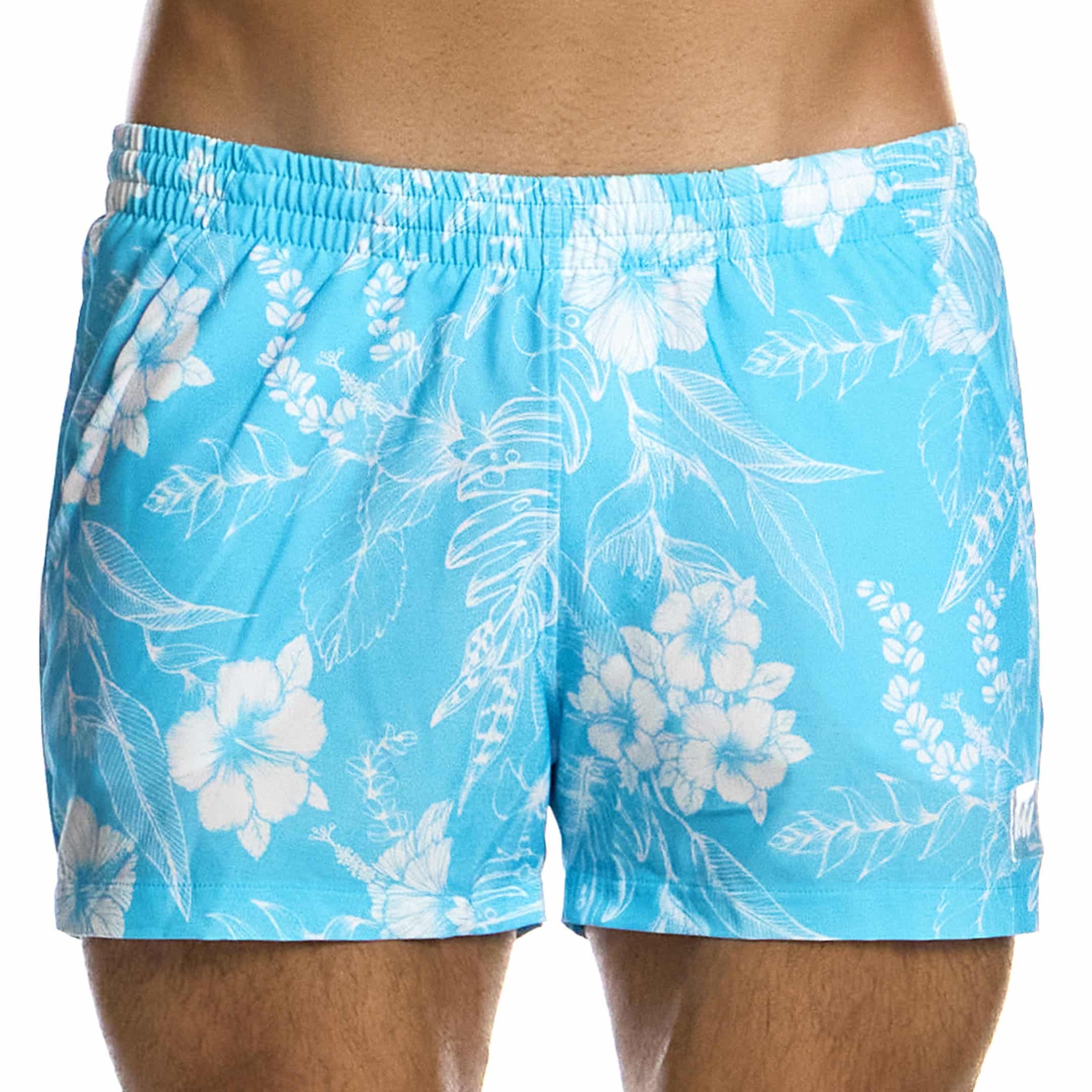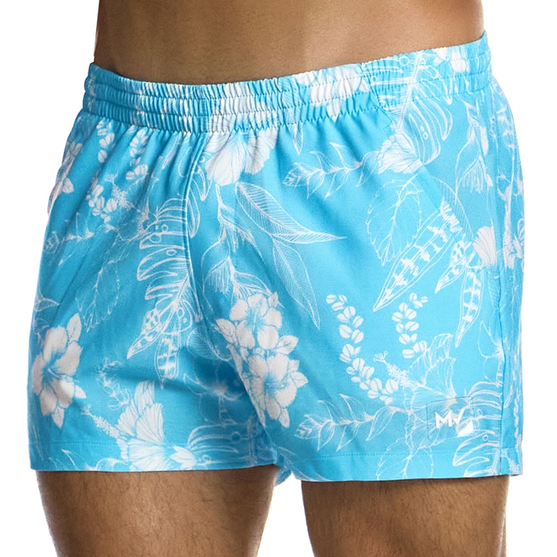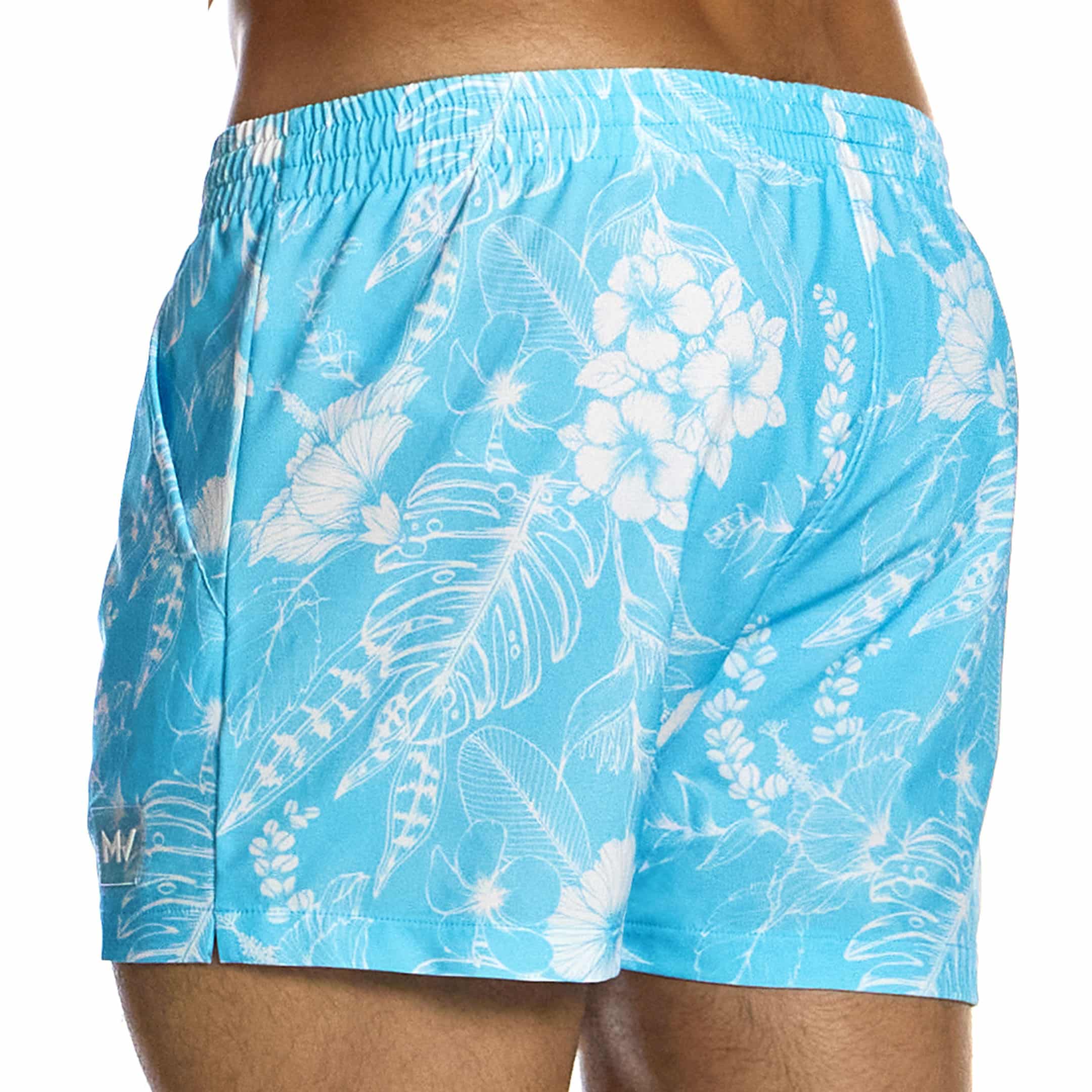 Mid-thigh swim shorts made from quick-drying microfiber. UV-resistant fabric recycled from plastic bottles. Elegant floral print. Comfortable cut with side pockets. Inner briefs for extra comfort and support. Fake fly. Elasticated waistband with inner drawstring. MV silicone label on left leg.