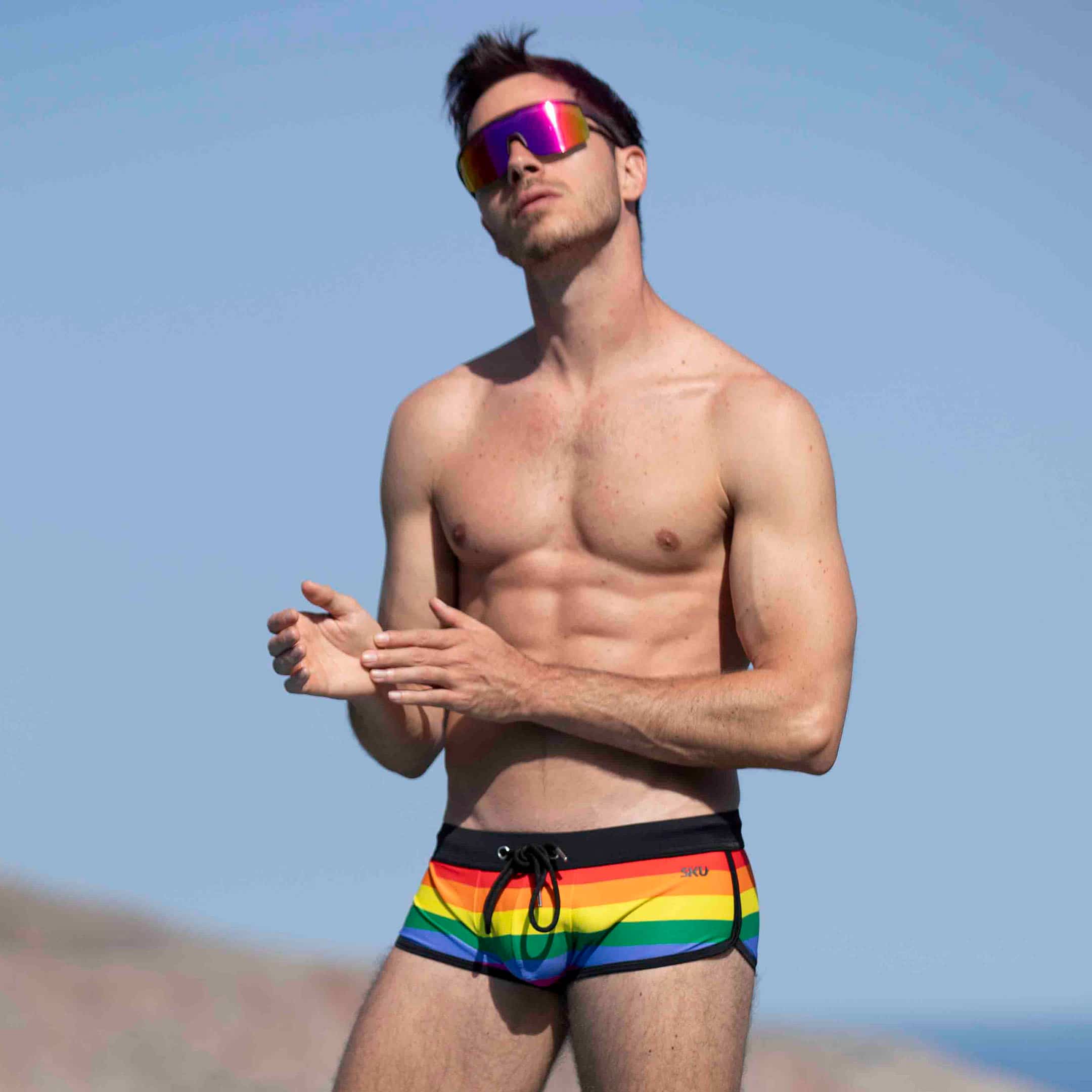 Swim trunk made from quick-drying microfiber featuring rainbow stripes. Low-rise and fitted cut. Lined front pouch. Contrast trim. SKU logo print ont the left leg. Elastic waistband with drawstring.