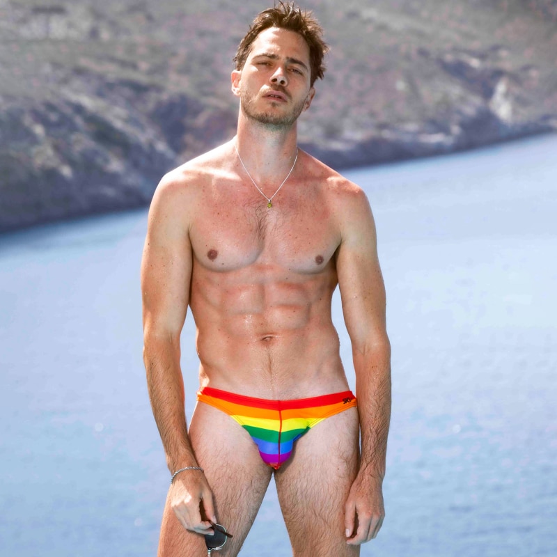 Mini swim brief made from quick-drying microfiber featuring rainbow stripes. Low-rise and fitted cut. Unlined front pouch. SKU logo print ont the left hip. Thin elastic waistband.