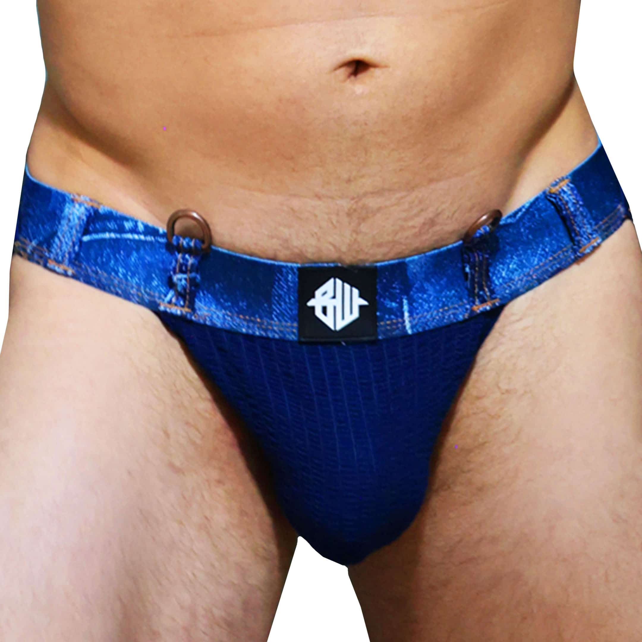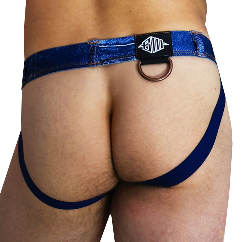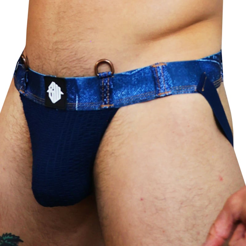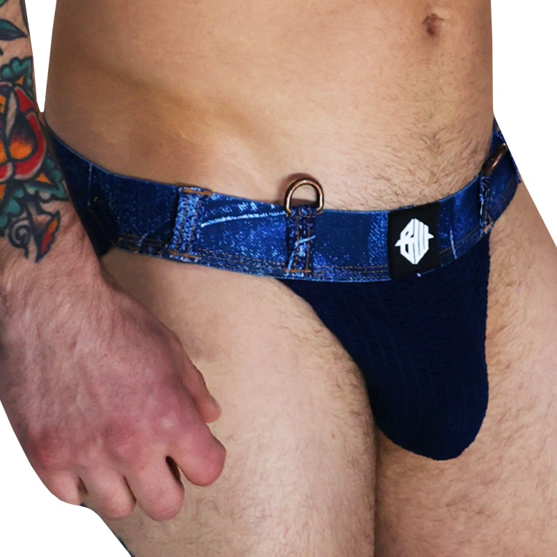 Jockstrap in knitted stretch fabric. Elasticated waistband in trompe-l'œil denim print. Contrast stitching, belt loops and antique copper rings. Deep front pouch. PVC Breedwell logo on front and back.
