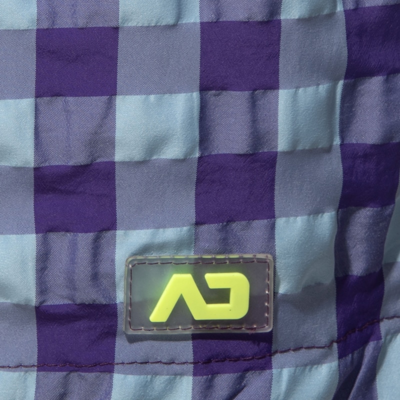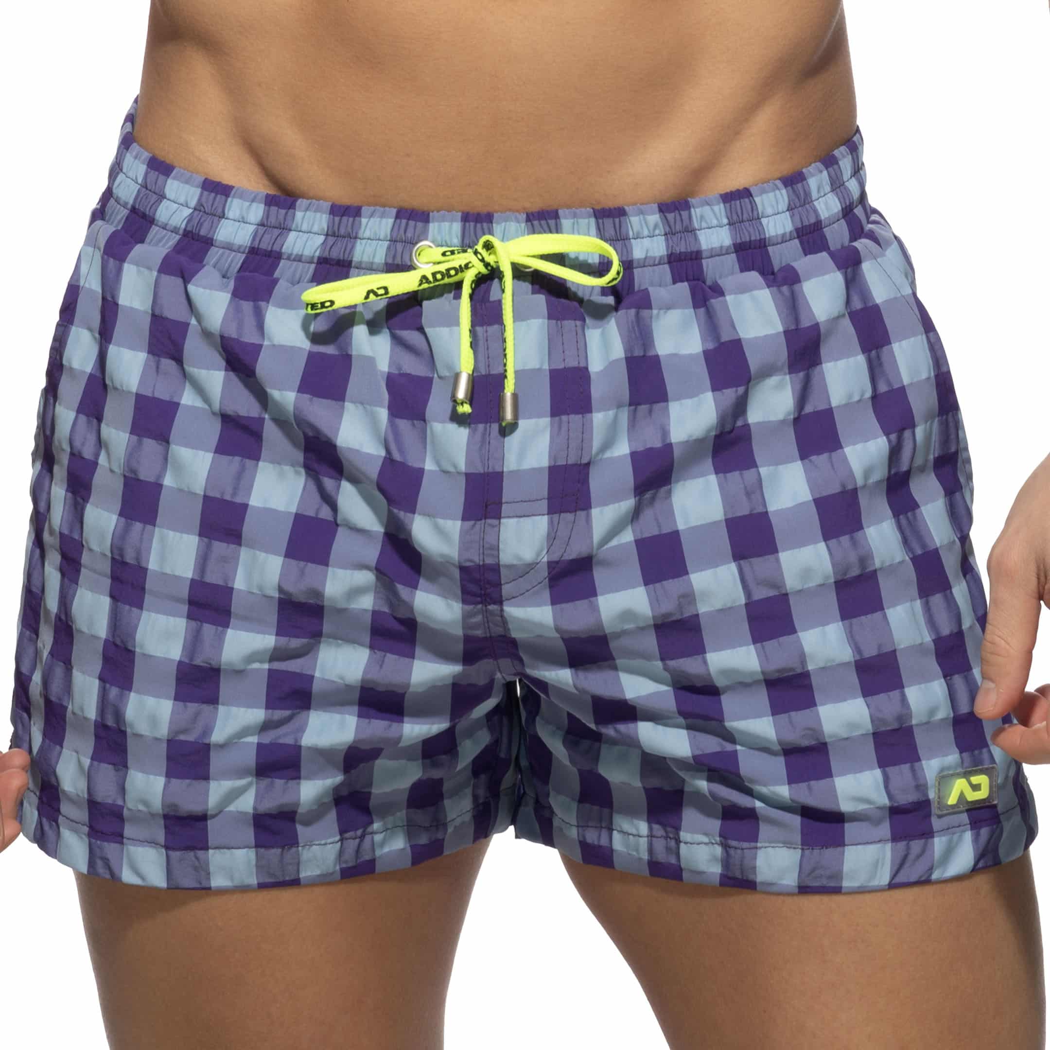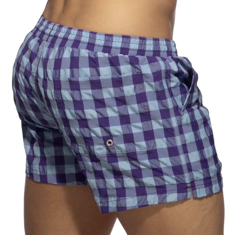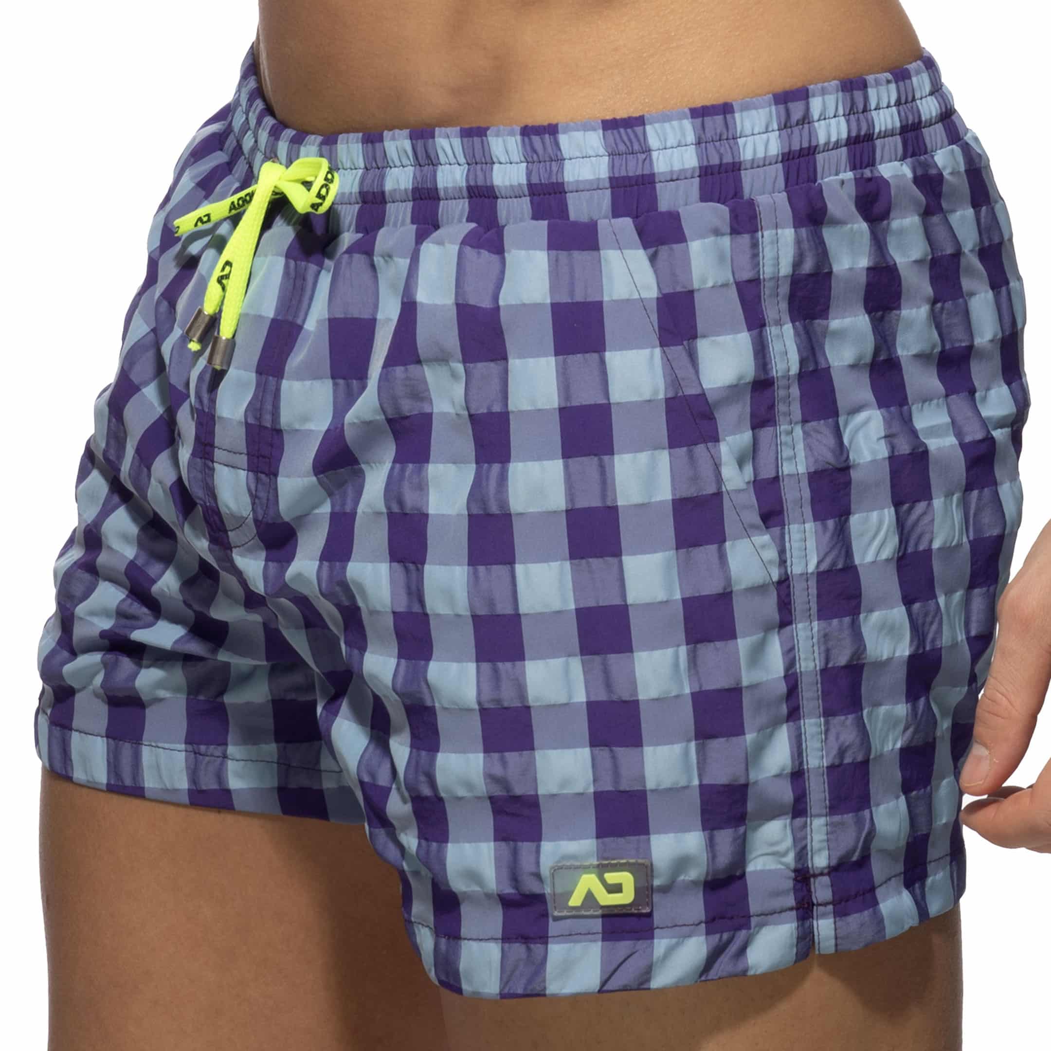 Swim shorts made from lightweight and quick-drying microfiber. Intense color check pattern. U-Shape mesh inner briefs for excellent support and comfort. Dual front pockets and one rear pocket with eyelet. Elastic waistband with drawstring. AD silicone label on left leg.
