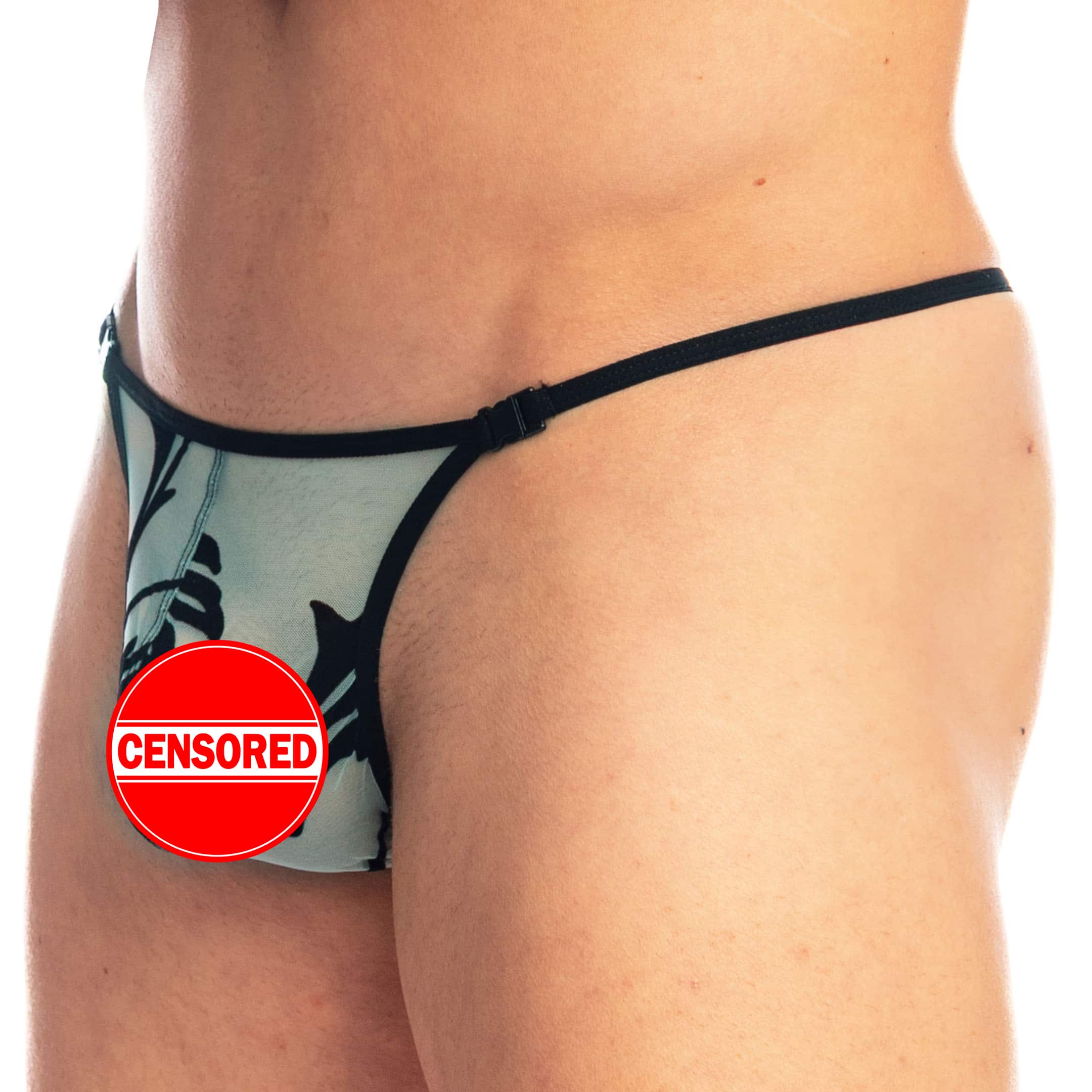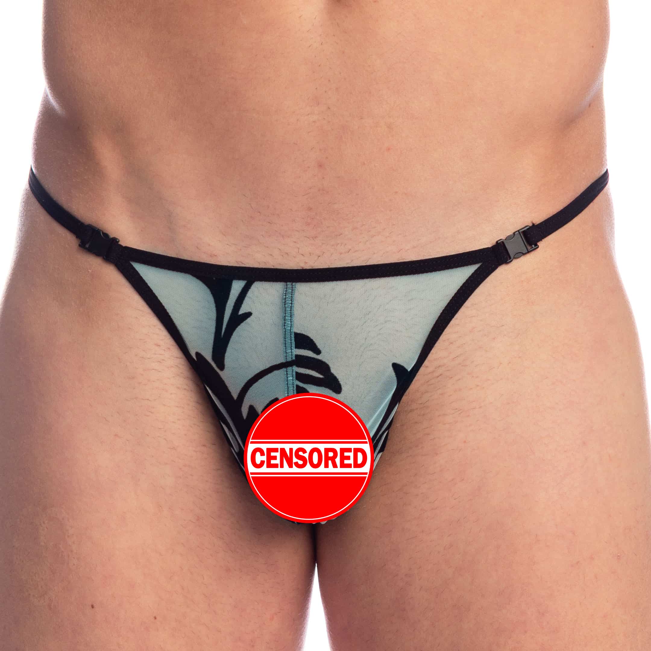 Sexy thong in sheer turquoise tulle, adorned with baroque pattern in black flocked velvet. Minimalist cut with functional clips. Ergonomic, unlined front pouch. Y-shaped back design to highlight your buttocks.