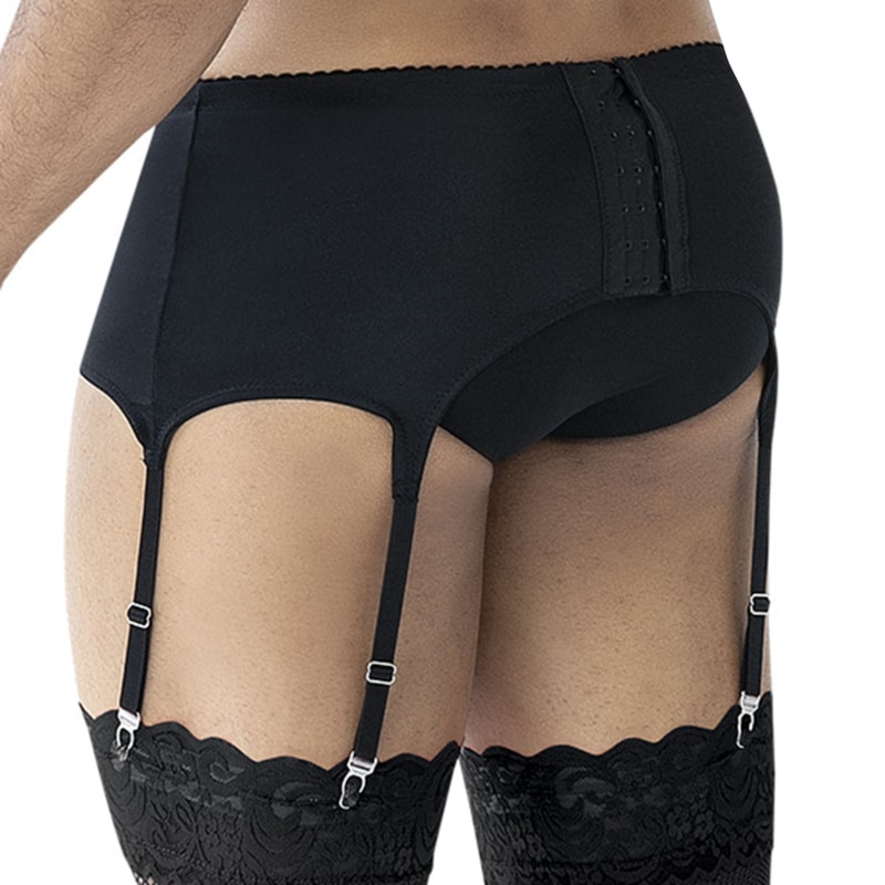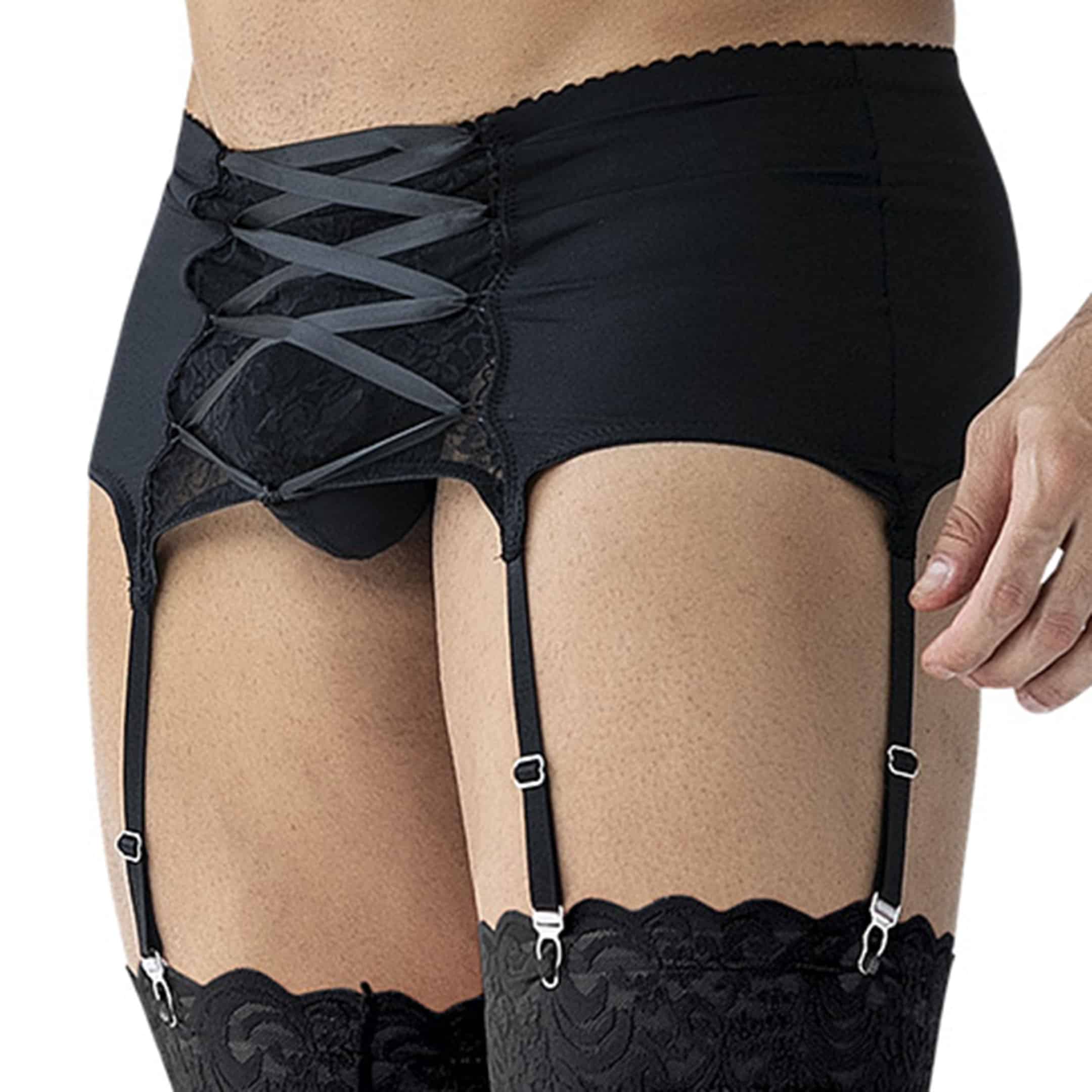 Provocative garter belt made from soft microfiber. Floral lace front insert adorned with an elegant corset-style lacing. 6 thin, adjustable suspenders with metal clips to fasten stockings. Hook-and-eye closure at back. Briefs and stockings sold separately.