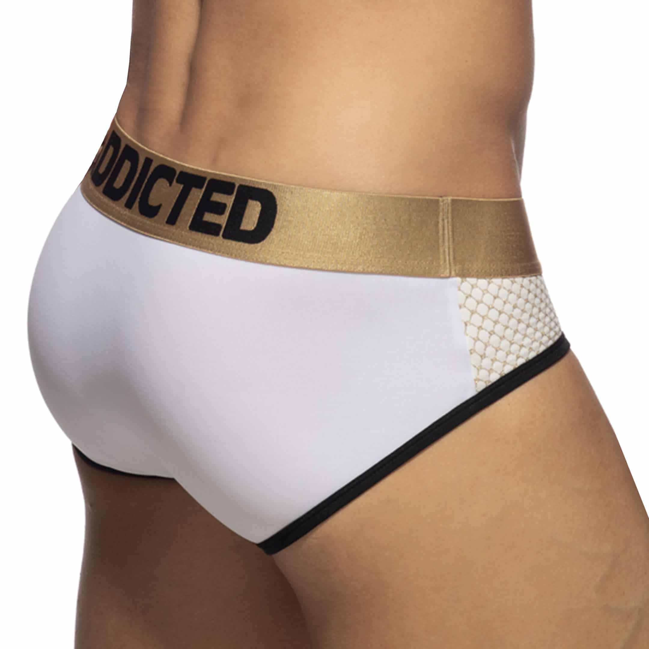 2 in 1 brief that can be worn both as underwear and as swimwear. Luxurious microfiber covered by lurex metallic threads for a chain mail effect on the front. Innovative design and fabrics ensuring comfort either under pant or under water. Low-rise and fitted cut. Addicted gold elastic waistband.